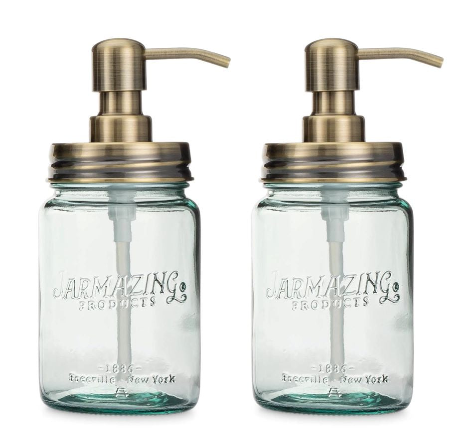 Style and sustainability meet in this gorgeous set of Jarmazing Products soap and lotion dispensers. The premium stainless-steel dispenser pump and beautiful recycled-glass mason jar will add a touch of farmhouse charm to any setting, from kitchen to bathroom to bedroom.