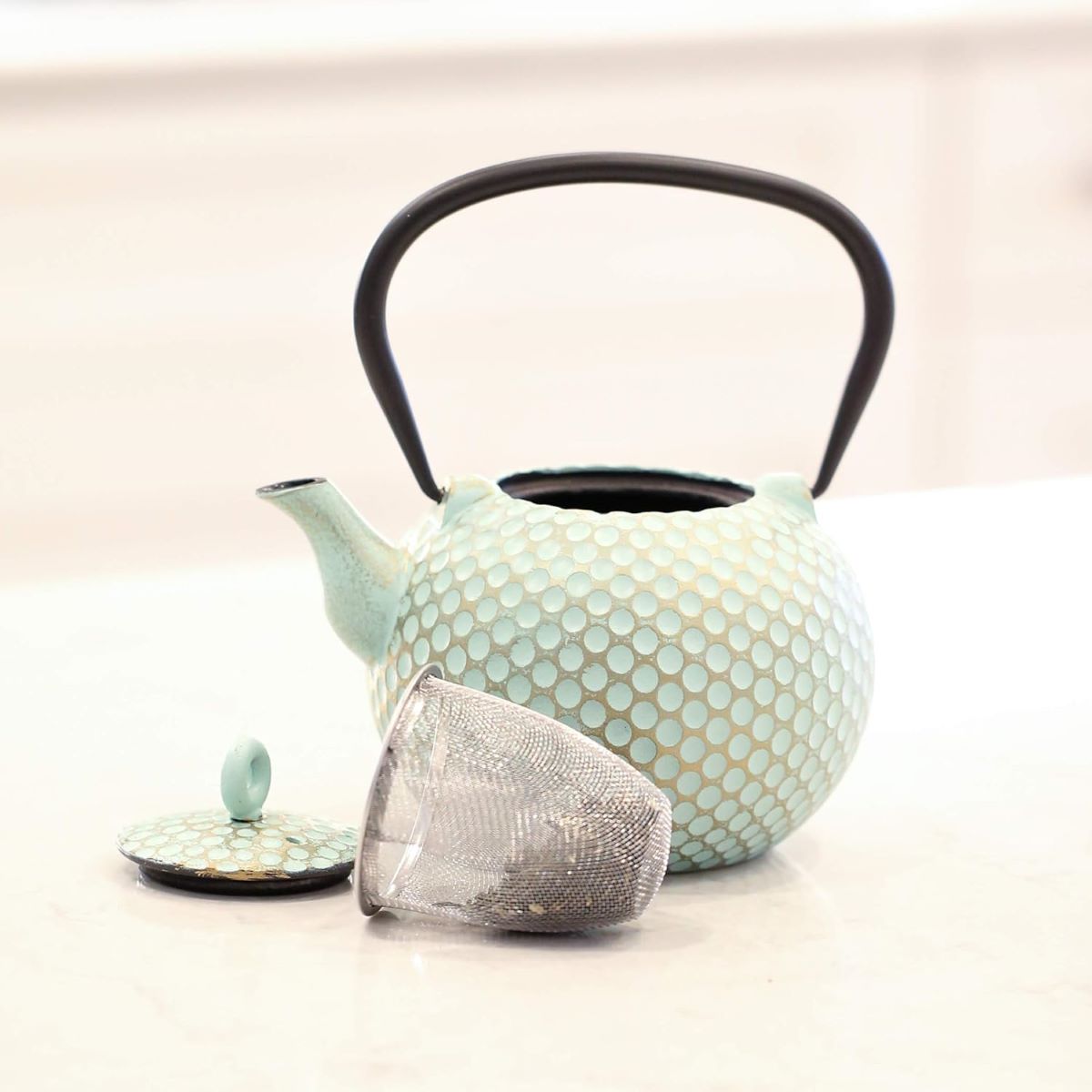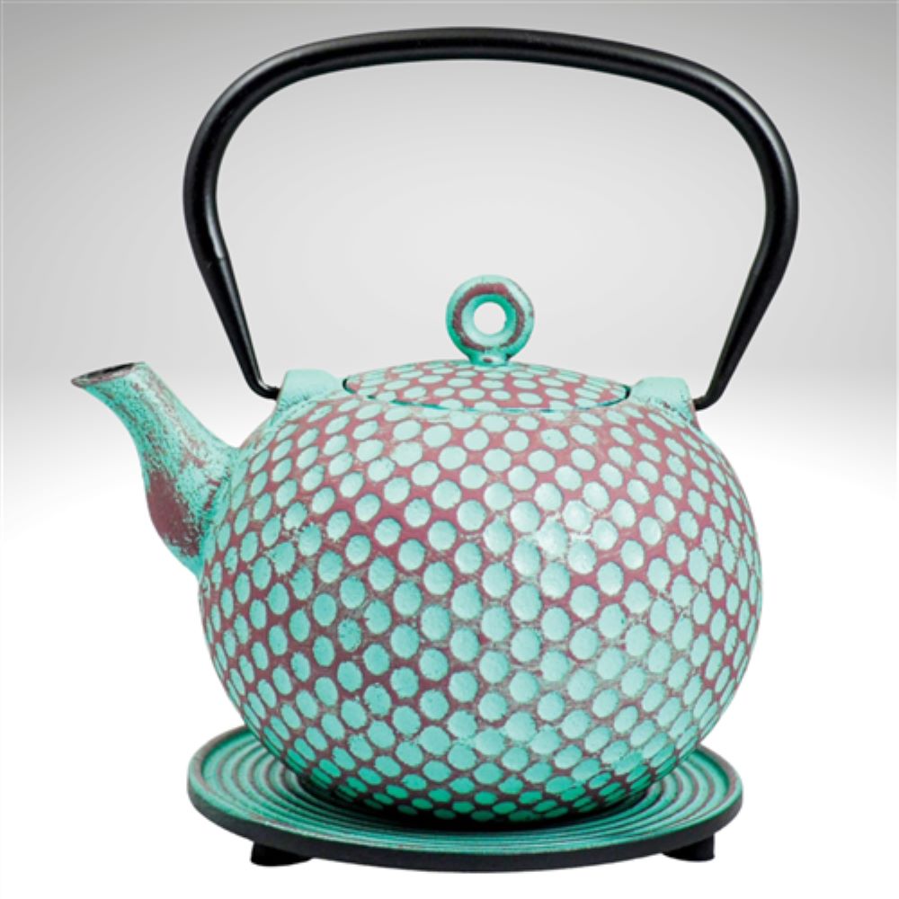 Our cast iron teapots showcase exquisite artisanship that harmoniously blends form and function. Crafted by hand using a rare sand casting technique, steeped in the rich Japanese tradition that has lasted for centuries, each teapot undergoes up to 40 intricate production stages, rendering every piece one-of-a-kind. The "Dim" teapot, which has a capacity of 34 fl. oz. and features a stainless steel infuser, boasts a captivating recessed circle pattern in the enchanting hues of green and red, carefully hand-painted onto the exterior. For optimal upkeep, the teapot must be hand washed and the exterior dried thoroughly after each use. Prior to first use, please ensure the teapot is cleaned thoroughly.