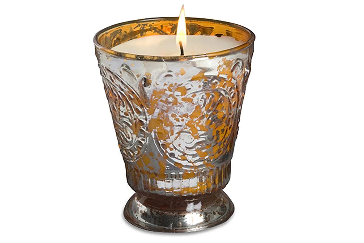 Bring a touch of the French Crown to your home with Himalayan's Fleur de Lys Collection. Made of silvered and antiqued glass with an embossed fleur de Lys pattern on a pedestal base, this candle collection comes in an assortment of timeless colors with coordinating Himalayan Signature Fragrances for an elegant and refined candle experience.