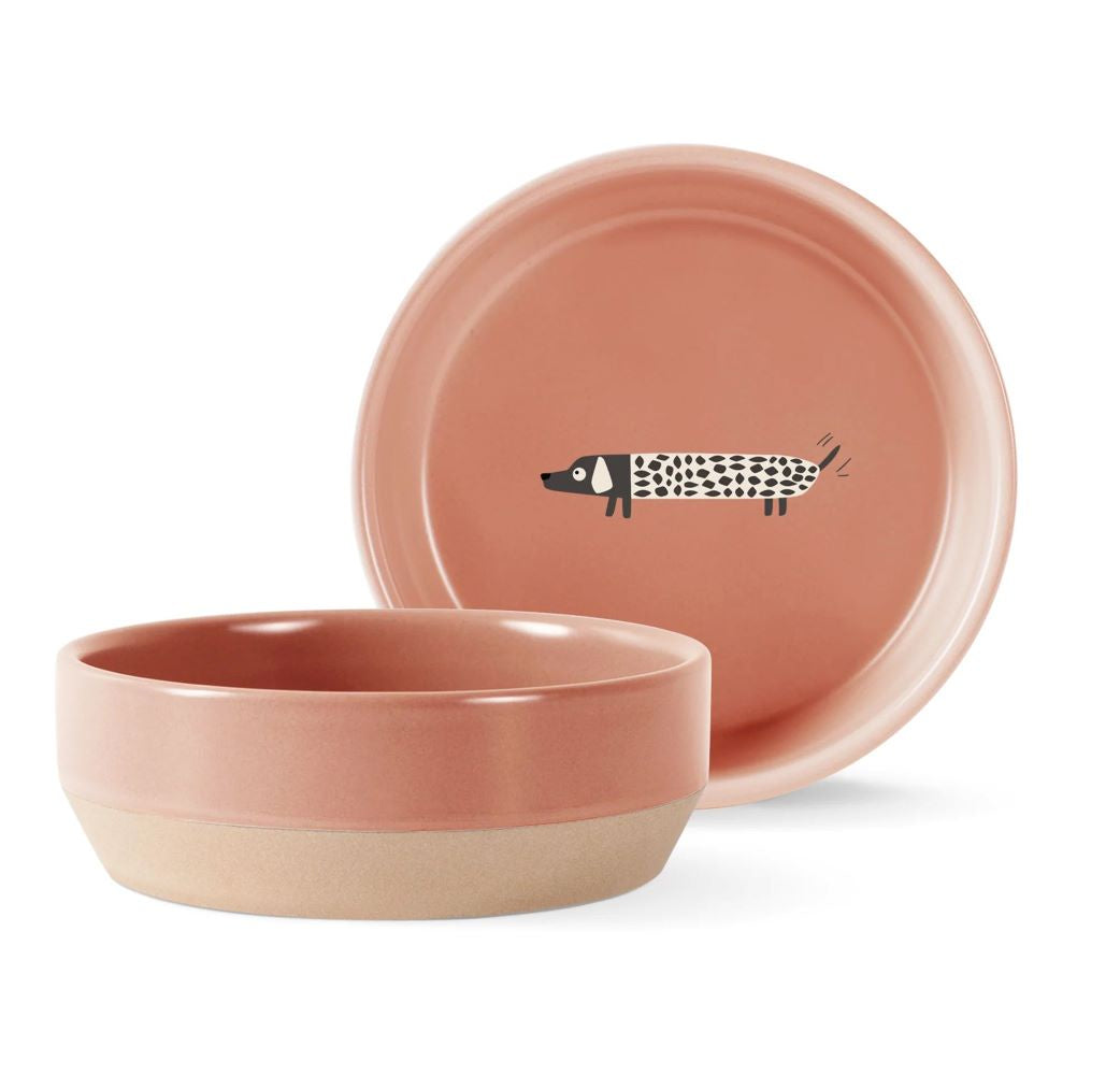 Medium pet bowl featuring Fringe original artwork with matte salmon glaze, decal art, and exposed stoneware base.