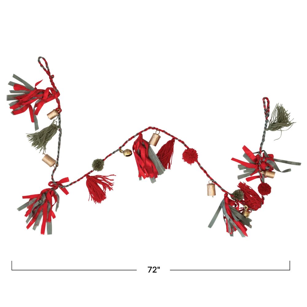 This festive garland features various styles of metal bells, pom poms, tassels, and found textiles, strung together with a 2-tone cord. Add a touch of festive whimsy to any space with our enchanting collection of garlands, including stunning glass, sleek metal, and delightfully plush options, all expertly crafted to create a merry and bright atmosphere.