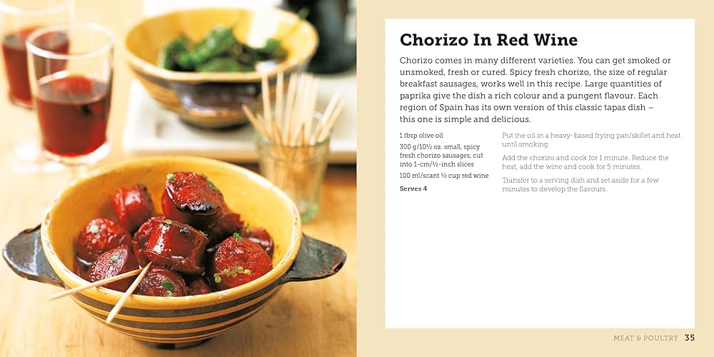 Served in bars all over Spain, tapas are the ultimate in bar snacks. From a simple bowl of olives to a mouthwatering selection of seafood, there is always something for everyone. Tapas are great shared among friends, making them the perfect choice for party nibbles or as an accompaniment to pre-dinner drinks. You can also serve them as a convivial appetizer for sharing or cook a range of dishes to make a more substantial lunch or dinner. Fish and Seafood are an essential part of any tapas menu and include delicious morsels such as Gambas al Ajillo (garlic shrimp) and Tigre Tapas (mussels in overcoats). No tapas selection is complete without traditional Meat and Poultry dishes, such as Cordero al Limón (lamb with lemon) and Chorizo al Vino (chorizo in red wine). Vegetables and Little Extras include classics such as Tortilla Española (Spanish omelet) and everyone’s favorite vegetarian tapas dish, Patatas Bravas (potatoes in tomato sauce). There are also essential accompaniments like Alioli and Almendras Saladas (salted almonds). This book contains all of the recipes you need to discover a new way of eating and entertaining.