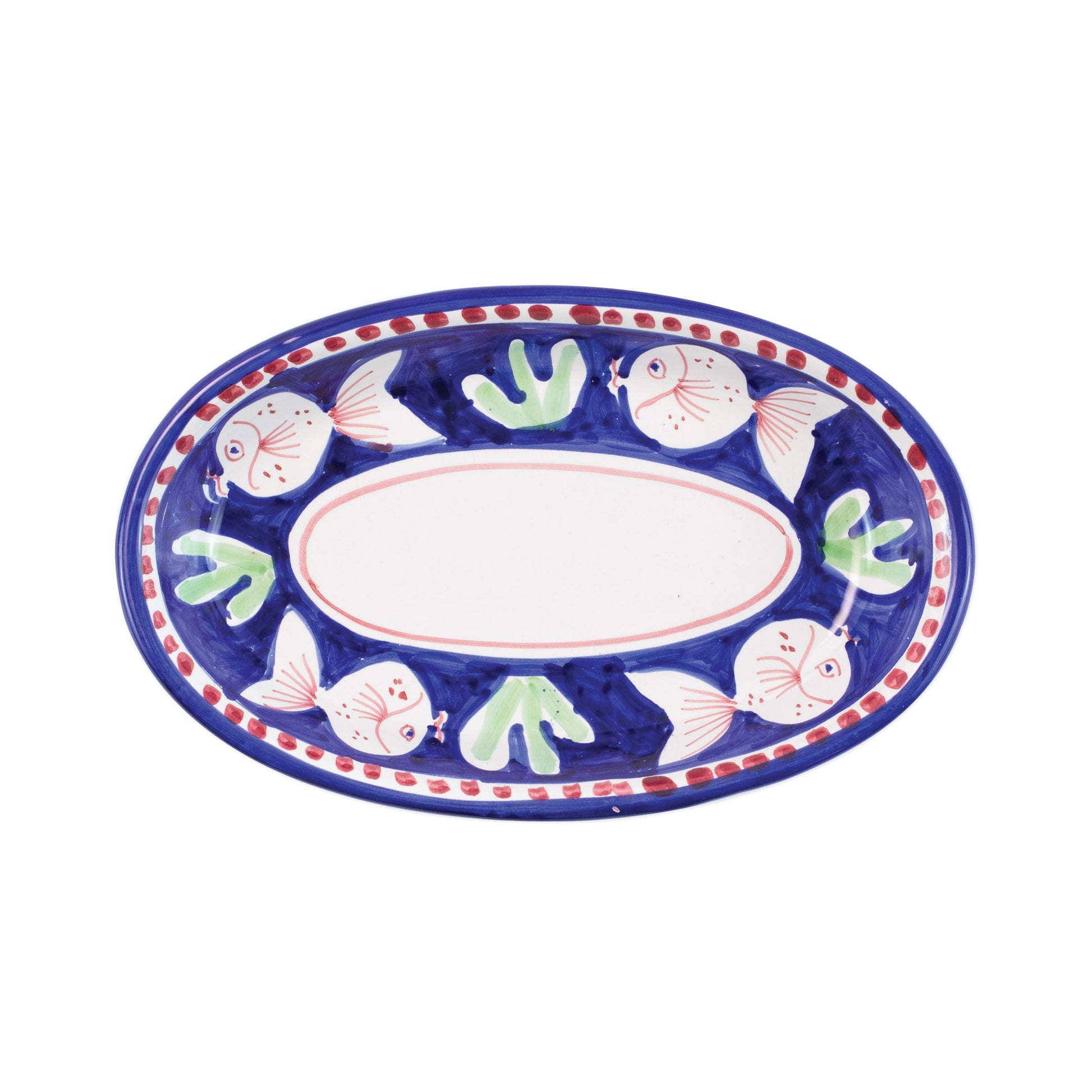 The colorful blue and red VIETRI Campagna Pesce Small Oval Tray features whimsical handpainted fish swimming among green algae.