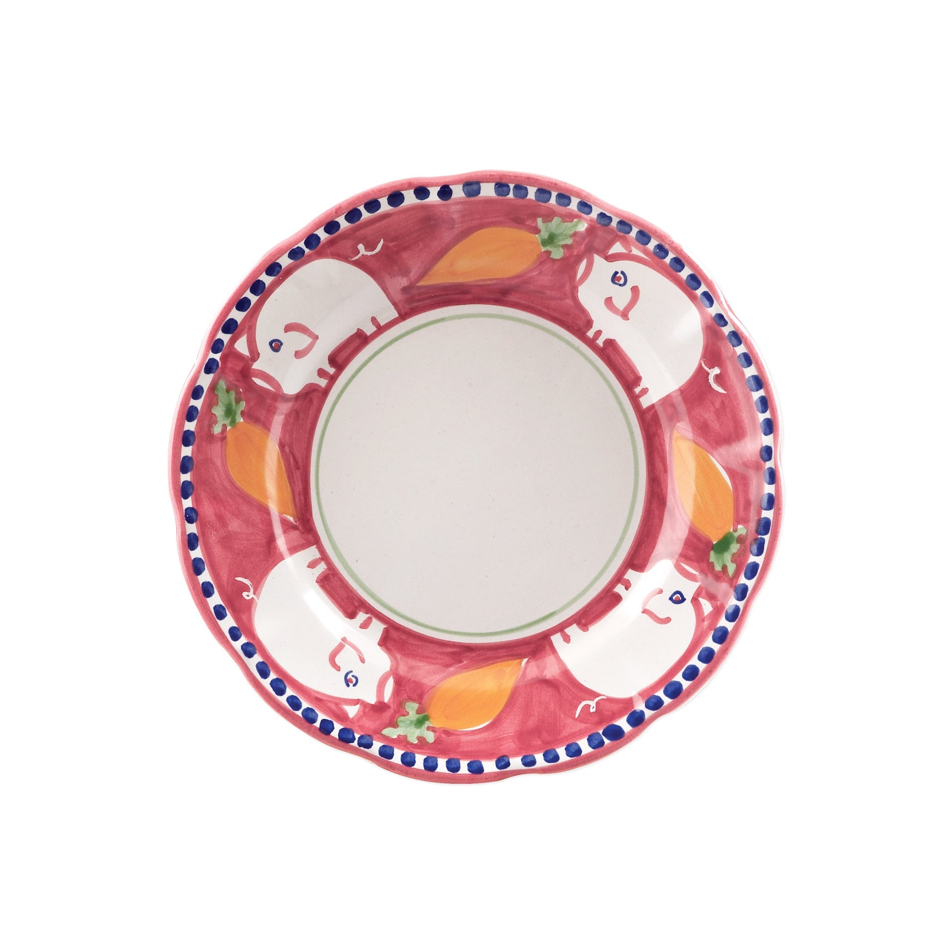 This colorful VIETRI Campagna Porco Coupe Salad Plate features whimsical handpainted pigs and carrots.