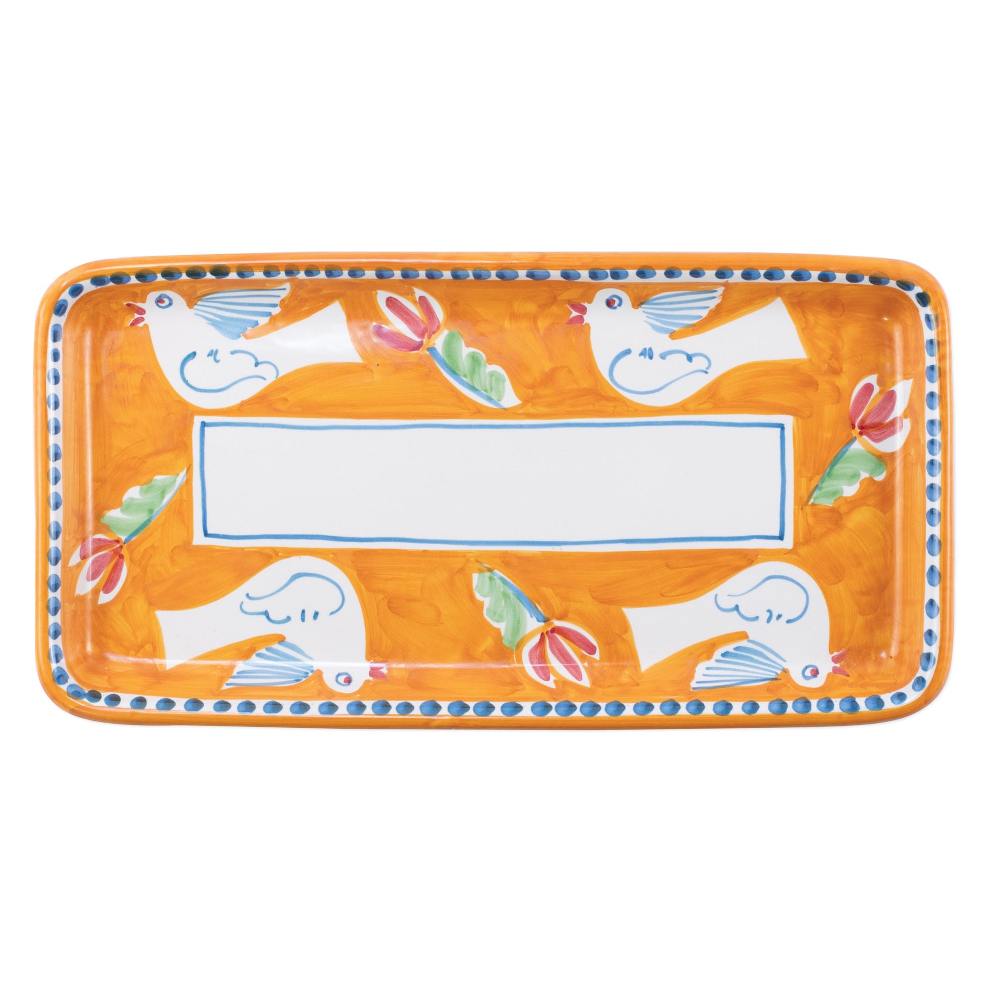 The colorful orange and blue VIETRI Uccello Rectangular Platter features whimsical handpainted birds and flowers and is part of our flagship dinnerware collection, Campagna. Mix with other animals from the Campagna collection to create a fun table that captures the vitality of the Italian countryside!