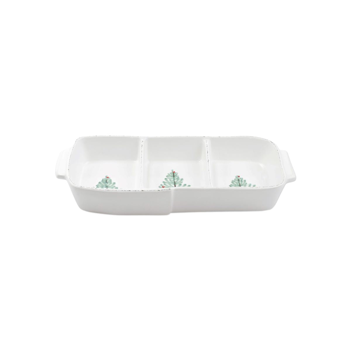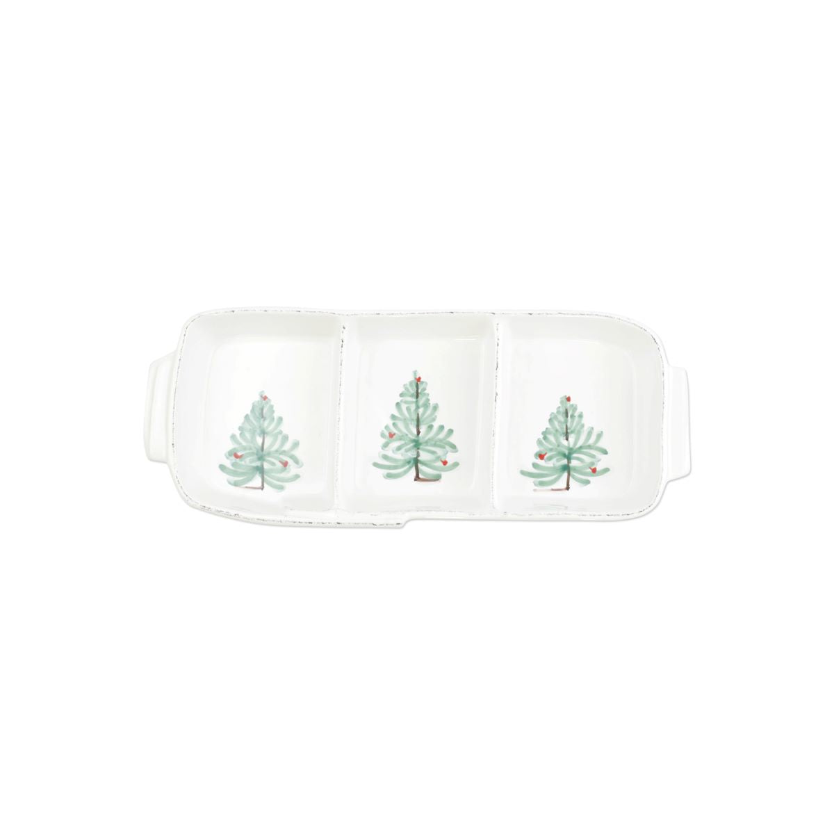 Delight in the holiday magic as handpainted fir trees and bright cardinals drift across the fresh white canvas of the VIETRI Lastra Holiday Small Three-Part Server. Mix and match with Lastra for a fun and sophisticated holiday table with a twist!