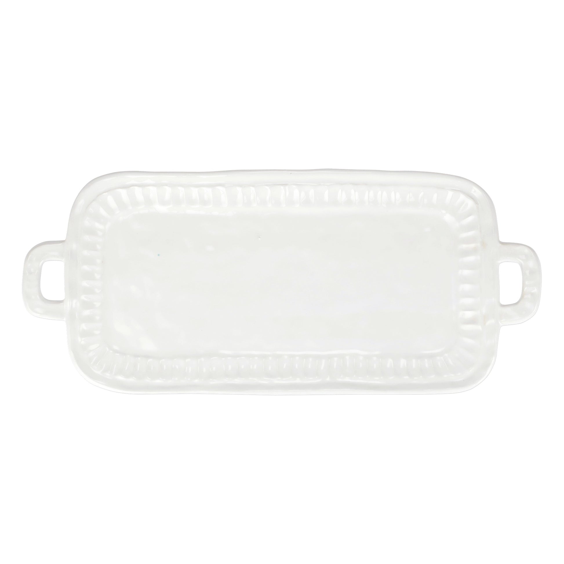 Pietra Serena, meaning serene stone, represents the simplistic beauty of the handpressed design found on the VIETRI Pietra Serena Handled Rectangular Platter.