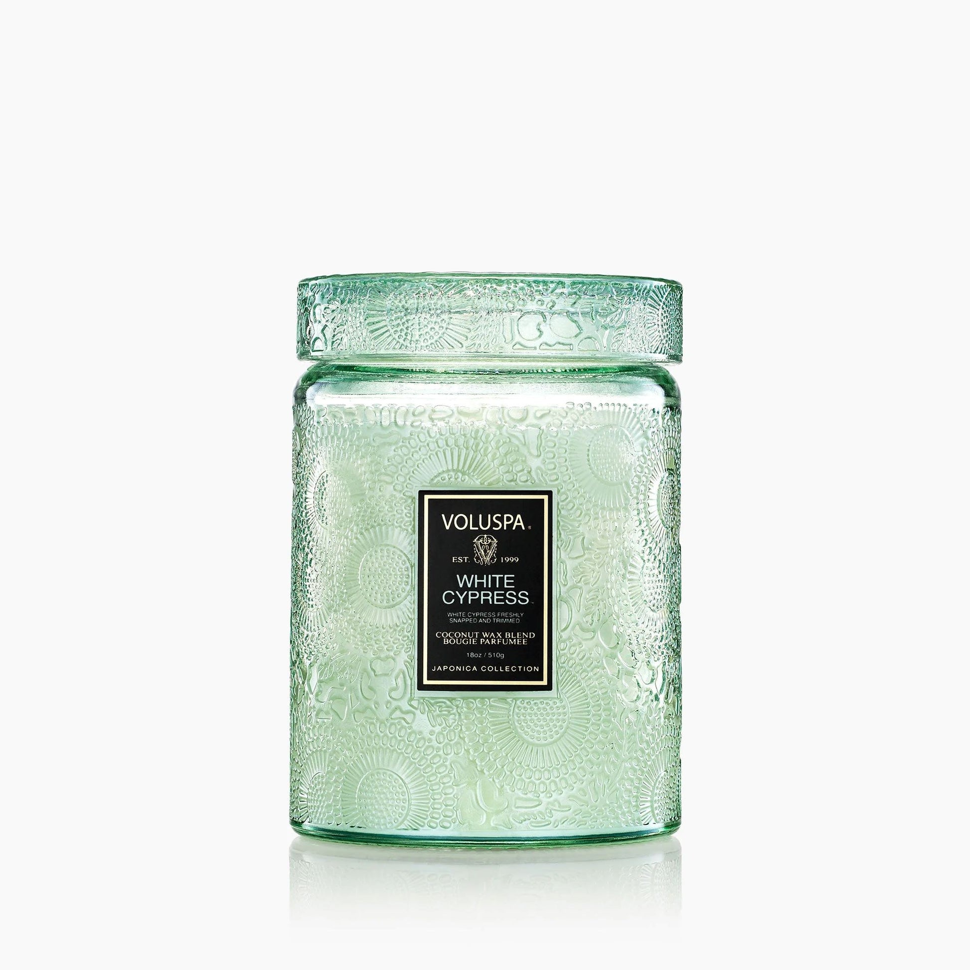 Voluspas unique coconut wax blend is hand-poured into a 18 oz. embossed glass vessel and is topped with a metal lid, adorned with Japonica detailing that keeps the candle dust-free when not in use. The single wick allows you to enjoy fragrance throw for 100 hours.